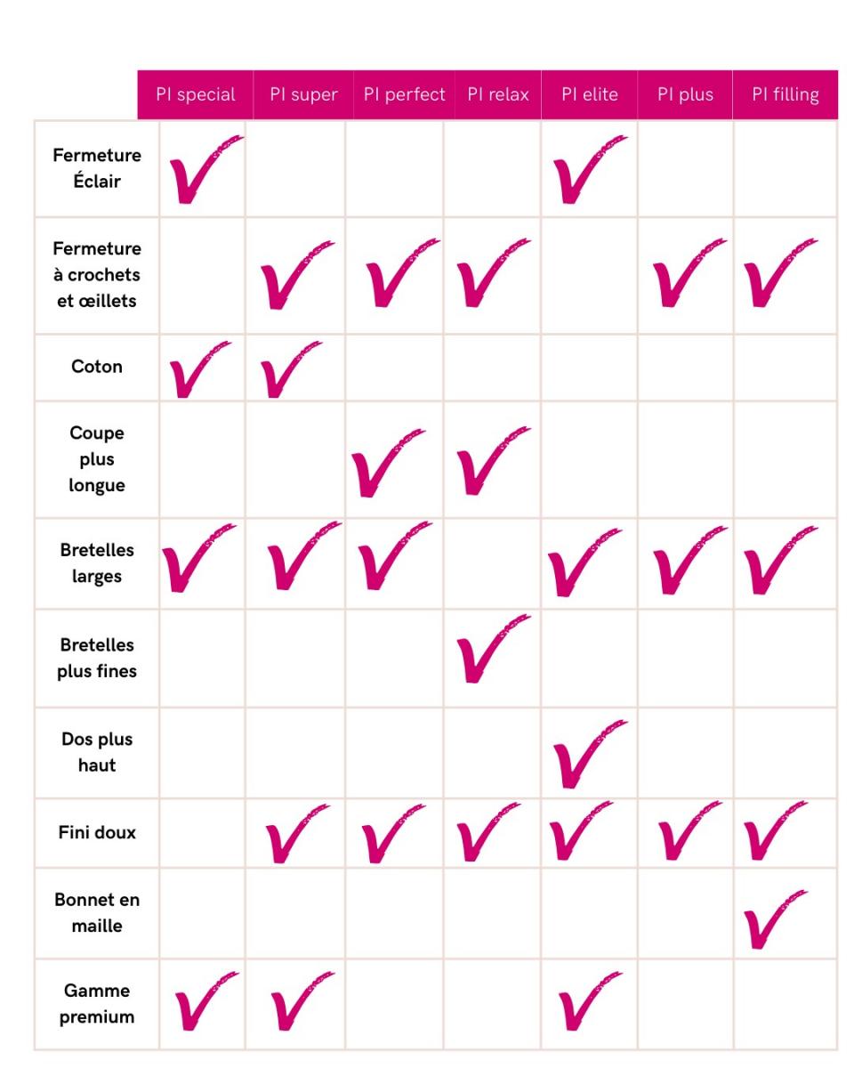 • PI plus : Dos plus haut et structure renforcée pour un soutien dorsal optimal, idéal pour les poitrines plus généreuses ou pour plus de stabilité et de couverture.