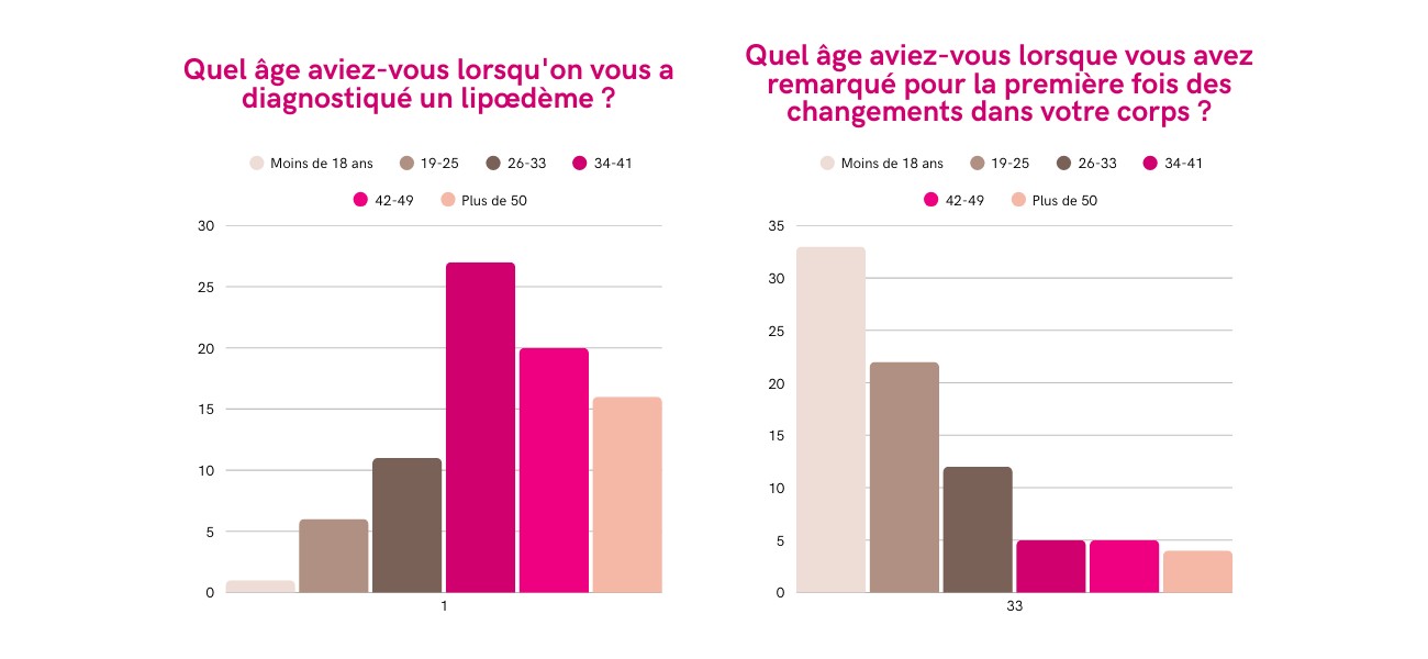 D’après notre enquête menée auprès de plusieurs femmes que nous appelons les « héroïnes du lipoedème », seulement 1 % ont été diagnostiquées avant l’âge de 18 ans. Pourtant, 33 % affirment avoir remarqué les premiers signes dès cette période, souvent à l’arrivée des premières règles ou lors d’une prise ou d’un changement de contraception.