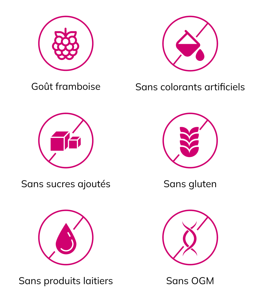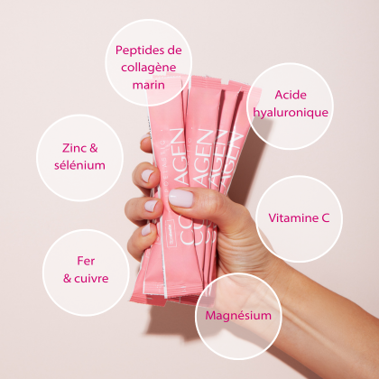 Ingrédients : Collagène hydrolysé issu de poisson, Lactate de Magnésium, Arôme de Framboise, Poudre de jus de betterave, Acidifiant : Acide Citrique, Gluconate Ferreux, Acide L-Ascorbique (Vitamine C), Citrate de Zinc, Hyaluronate de Sodium, Édulcorant : Glycosides de Stéviol issus de Stévia, Gluconate de Cuivre, Sélénite de Sodium.