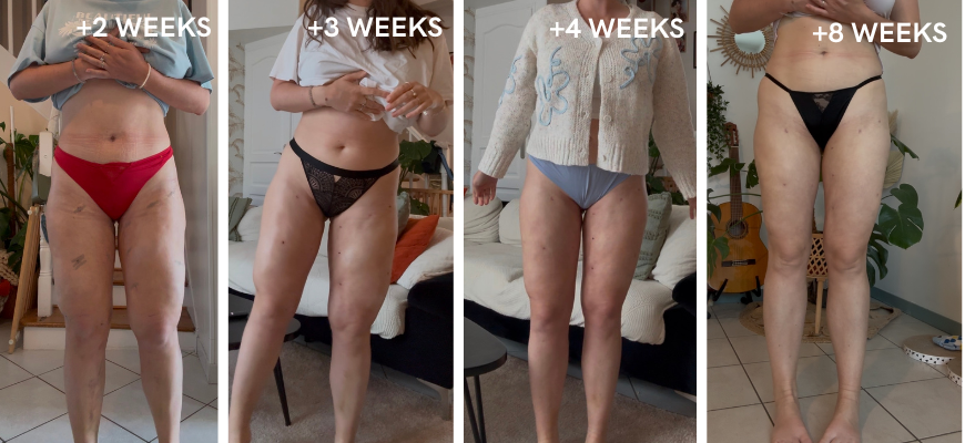 J'ai commencé à remarquer des changements significatifs vers la quatrième semaine ! Avant cela, j'avais pas mal d'œdèmes et quelques séromes, mais ceux-ci ont progressivement diminué avec le temps grâce à des massages de drainage lymphatique réguliers.